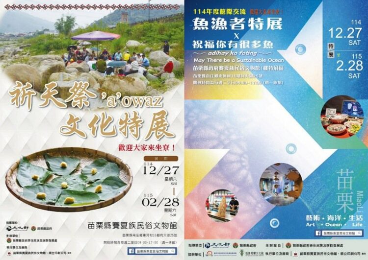 苗栗縣賽夏族民俗文物館將自114年12月27日至115年2月28日,推出「賽夏族祈天祭 ‘a’owaz 文化」及「魚漁者」兩大聯合特展,以「文化傳承 × 環境永續」為主軸,從山林走向水域、由祭儀延伸至日常生活,呈現臺灣原住民族多元而深刻的文化樣貌,亦是苗栗縣推動原住民族文化保存與教育的重要成果。