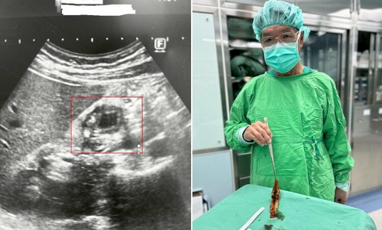圖左:49歲男子因心窩悶痛與右上腹脹痛,五年來四處求醫,近期至博田國際醫院肝膽胰外科看診並接受檢查時,才被發現罹患「膽囊腺肌症」。圖右/博田國際醫院肝膽胰外科李金德教授以單孔腹腔鏡,進行膽囊切除手術。