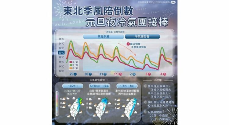 週二(30日)東北季風稍增強,北部及東北部氣溫下降;週三(31日)、週四(1月1日)受到東北季風影響,各地早晚稍涼;新竹以北、東北部地區有短暫雨,苗栗、花、東及恆春半島有局部短暫雨,其他地區為多雲到晴。