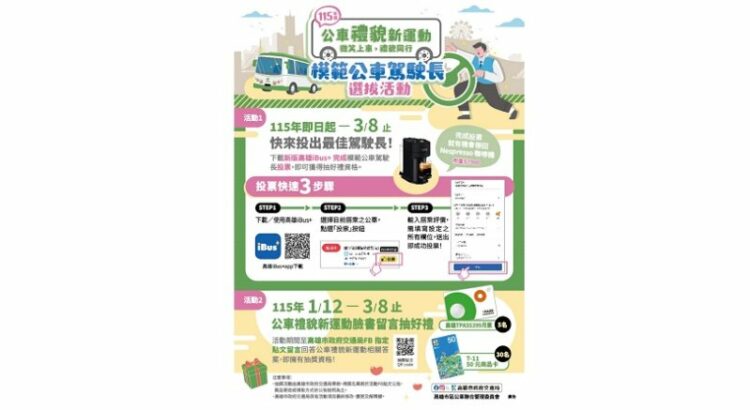今年活動除了由民眾參與投票選出最優秀的公車駕駛長外,也希望提升民眾對乘車禮儀的認識與熟悉度,交通局將於臉書官方粉絲專頁推出「公車禮貌新運動|大家來找碴」系列活動,邀請民眾於115年1月12日至3月8日在活動貼文下方留言回答「正確的禮貌行為」,就有機會抽中TPASS高雄市區通勤月票及商品禮券,歡迎民眾踴躍參與,希望大家搭乘公車下車時也別忘了給駕駛長一個微笑感謝或口頭鼓勵,感謝他們的辛勞服務。