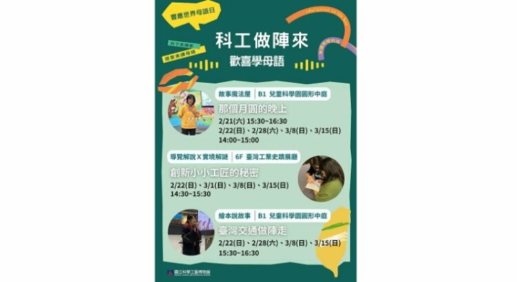 響應聯合國教科文組織(UNESCO)倡議的「2月21日國際母語日」,國立科學工藝博物館(科工館)推出「科工做陣來‧歡喜學母語」系列活動,自2月21日至3月15日登場,透過臺灣台語導覽、繪本導讀與手作體驗,將科普教育與本土文化融合,打造親子共學的母語友善環境,邀請民眾一同感受母語之美。
