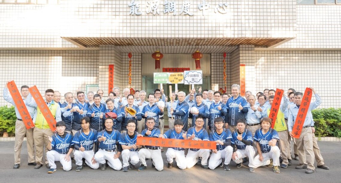 圖/黃建智董事長(中間右7)手持球棒並與經理部門主管及公用設施處同仁換上棒球服裝,手持春聯及加油標語,傳遞振奮人心的正能量,準備在關鍵的一年揮出致勝的一擊!