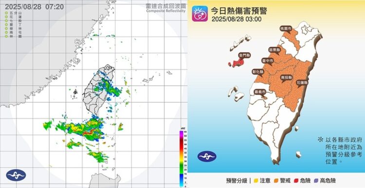 週四(28日)各地晴到多雲、高溫炎熱,桃園以北高溫上看38度;全台中午前後紫外線偏強,容易達過量甚至危險等級,外出請做好防曬並多補充水分。
