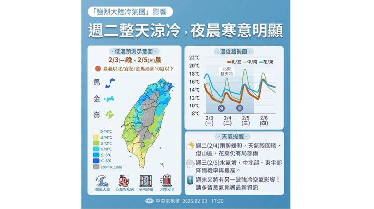 蛇年開頭冷颼颼,昨天起至週三期間,台灣受到新一波強烈大陸冷氣團影響,各地氣溫明顯下滑,最低溫預計落在今明兩天的清晨,北部多數地區低溫僅九至十一度,週四、週五回暖但幅度有限,週五晚間起,會有另一波強度相近的強烈大陸冷氣團繼續影響台灣。