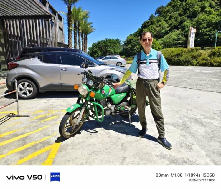 這次看到郵差送信,郭不會自己介紹,只是說:「我是退休員工,年輕人,你送信還面帶微笑,敬業喔!」這不是官樣話,是關心,自在,長者好表現。當然他一起出遊的雄中同班好友,請他和公務機車合影,欣然同意。不過同學在媒體工作,不會放過機會,把退休的郭副總來個素描,其實文字素描,相片「寫真」,人生寫意!