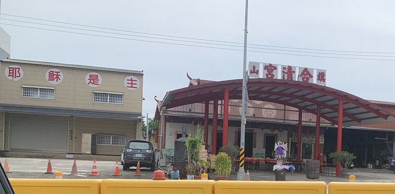 圖中,右方的道教「合清宮」與左方基督教聚會所,比鄰而居,坊間罕見,有互不「侵犯」違和的感覺。位置又恰巧位於高屏溪前方,說明旗山市區要找較大的活動空間,不是件容易的事。