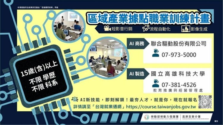 在快速變動、講求工作效率的職場,透過學習獲得職場技能是每位勞工自我能力提昇的不二法門,勞動部勞動力發展署高屏澎東分署(簡稱高分署)根據國家產業發展政策及轄區產業聚落發展狀況,114年成立AI商務及製造兩個人才培訓據點,開辦一系列人工智慧相關職業訓練課程,不僅能為民眾進入相關領域助一臂之力,也提供企業轉型所需人才。
