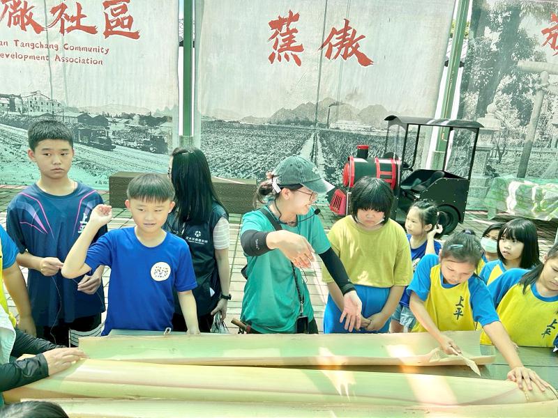 首先,志工帶領學童體驗「香蕉取纖」,讓孩子們透過實作認識植物纖維的用途,培養資源循環與永續利用的觀念。接著,孩子們參觀糖廠遺址,透過導覽深入了解臺灣糖業發展歷史與食品來源,增進文化與生活連結。