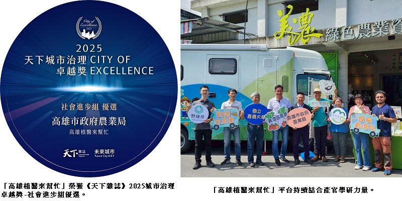 高市府農業局推動的創新服務「高雄植醫來幫忙」,自全國 22 縣市、171件參賽專案中脫穎而出,榮獲《天下雜誌》2025城市治理卓越獎—社會進步組優選,為智慧農業再添榮耀。