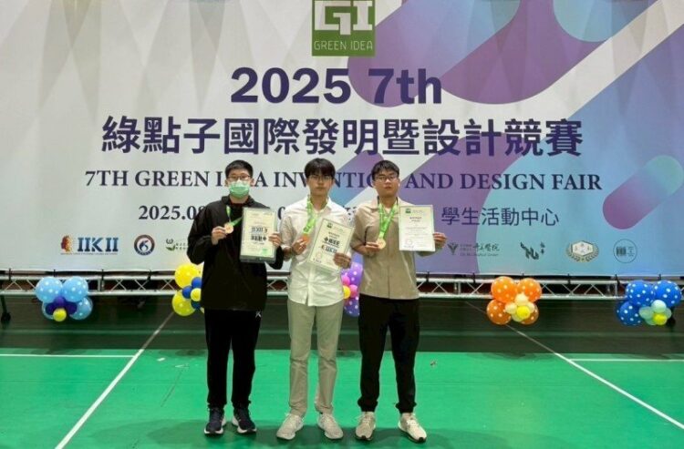 圖/2025國際綠點子發明暨設計競賽,參與學生左起歐冠辰 、王晟守、蔡承沅。義守大學提供