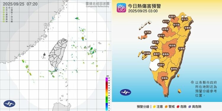 週四(25日)各地大多為多雲到晴,東南部、恆春半島及外島地區,將有局部短暫陣雨;基隆北海岸、東北部及東部地區,亦有零星短暫陣雨。午後,山區則有局部短暫雷陣雨。