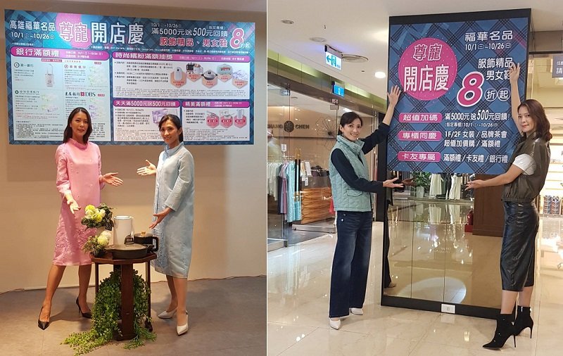 據高雄福華名品公關室主任柯夙娟表示,這次開店慶活動卯足全力做促銷活動,10/1~26祭出指定專櫃天天滿5000元送500元名品抵用券回饋活動外,指定專櫃累積消費滿10000元、30000元、50000元即可兌換時尚好禮,活動當日消費滿5000元即可兌換摸彩券乙張,消費者就有機會抽中新竹、石門、溪頭、高雄、墾丁福華大飯店住宿券、福華名品抵用券、時尚小家電、台中福華飯店雪蛤燕窩飲&上選滴雞精禮盒…等多項好禮。
