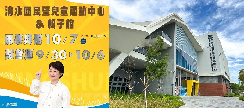 運動局提醒,清水國兒運將於9月30日至10月6日試營運,全館免費開放,歡迎市民踴躍到場體驗。更多資訊可至清水國民暨兒童運動中心(https://www.facebook.com/profile.php?id=61575524413505)與清水親子館臉書粉絲專頁( https://www.facebook.com/profile.php?id=61577845540273)查詢。