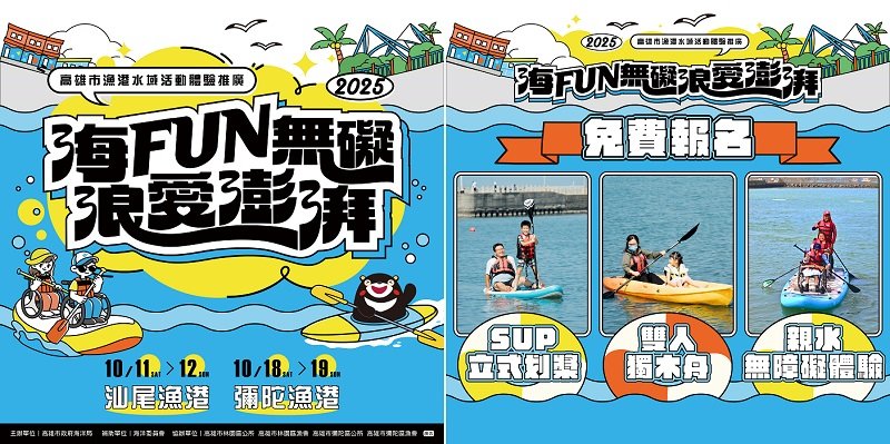 高雄市政府海洋局攜手海洋委員會海洋資源處,將於114年10月連續兩個週末(11、12日及18、19日),分別在汕尾漁港與彌陀漁港盛大舉辦「海FUN無礙、浪愛澎湃」漁港水域活動,主打SUP立式划槳與雙人獨木舟體驗,並特別規劃無障礙體驗,讓身心障礙者也能自在下水,享受親海樂趣,歡迎民眾把握機會前往「伊貝特網站」報名參加。