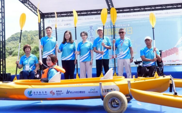 圖/無障礙海洋日活動啟動儀式(左4蕭美琴副總統、左3海委會管碧玲主委、左2運動部李洋部長、左1輪椅夢公園呂嘉儀營運長、右3明怡基金會張明正創辦人、右2中華民國身心障礙者休閒運動推廣協會蔡有仁會長、輪椅夢公園陳國嘉創辦人,前方獨木舟內是日本東京帕運親善大使二條實穗)