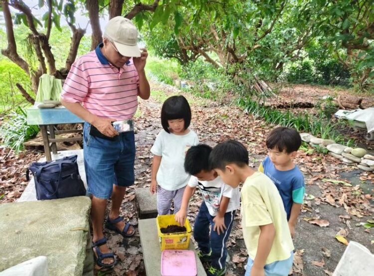 星期六上午,連絡他高中同學,確定在田工作,馬上跨越縣市,四十公里不遠,專程帶孫子去見識。正好田裡面堆肥有兩隻雞母蟲,園主人特地以盒子裝牛糞堆肥,連同兩隻「土產」雞母蟲,讓小朋友帶回去觀察生態。