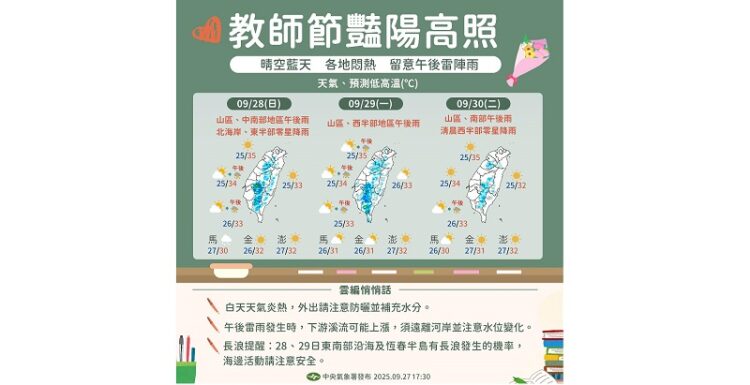週日(28日)高溫炎熱,西半部有局部36度以上高溫發生機率。迎風面的基隆北海岸、東半部及恆春半島有零星短暫陣雨;午後,中南部及其他山區也有局部短暫雷陣雨。
