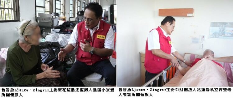 曾智勇主委由花蓮縣政府原民處馬處長的陪同至馬太鞍教會、大進國小兩處安置所,關心族人收容狀況。曾主委表達對族人的慰問,也掌握災後需求;同時與馬太鞍教會牧師及長老的洽談,了解因安置人數眾多而面臨人力不足的困境,當場表示會請縣府及社工支援,另積極溝通族人轉往旅宿公會安排的旅宿,讓族人有更舒適的收容處所,也減輕教會負擔。下午,曾主委再赴吉豐養護所,探視由光復長照中心撤離的24名失能長者,除表達政府關懷,也指示相關單位持續提供必要醫療照顧與生活協助。