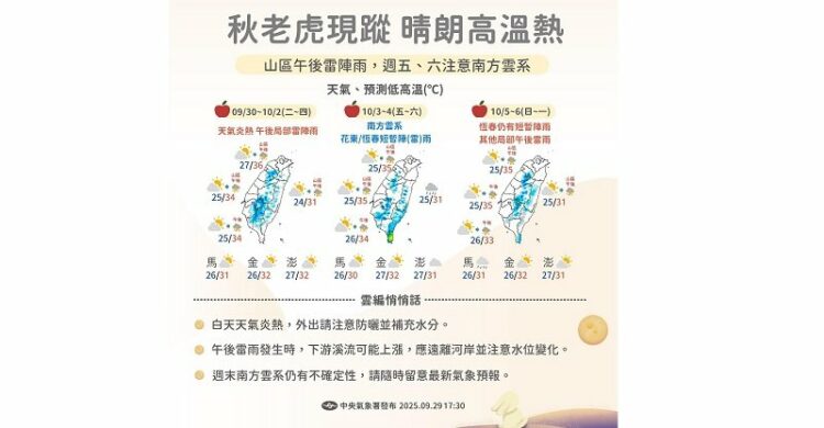 下週日(10月5日)至下週一(10月6日)水氣減少,各地大多為多雲到晴,僅恆春半島有局部短暫陣雨,午後中南部地區及其他山區有局部短暫雷陣雨。週三至下週一東半部高溫約31至32度,西半部高溫33至36度,澎、金、馬高溫約30至32度;低溫方面台澎金馬則約為24至27度。