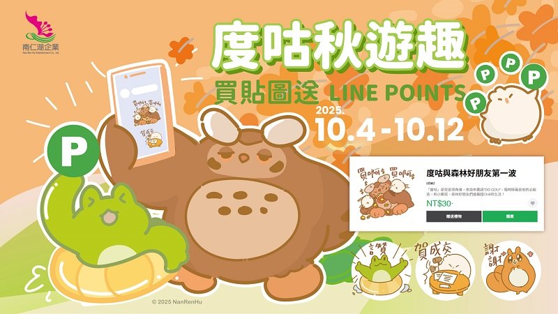 今年10月連假接力開跑,中秋節與國慶日熱鬧登場,南仁湖特別推出「買貼圖回饋LINE POINTS」活動,10月4日至12日於中壢、湖口、古坑服務區及大武之心南迴驛,當日單筆消費滿NT$200元並加入南仁湖LINE官方帳號,購買「度咕與森林好朋友LINE貼圖」,即可獲得LINE POINTS 30點;活動期間入住小墾丁渡假村的旅客,只要完成步驟,同樣可輕鬆拿好康。
