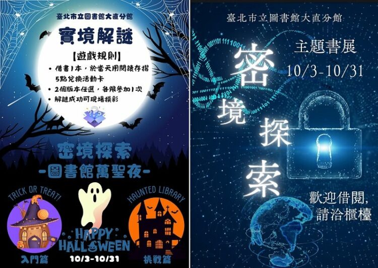 今年十月,臺北市立圖書館大直分館將化身神秘的知識迷宮,邀請讀者一同展開「密境探索—圖書館萬聖夜」活動。活動結合主題書展與實境解謎,以「密碼學」與「解謎」為核心,打造一場兼具學習與趣味的萬聖節體驗。