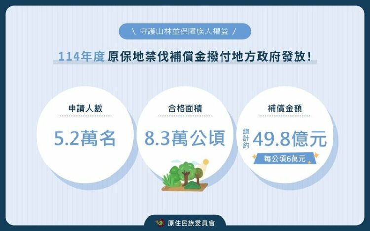原民會統計,截至114年9月底止,已有超過5.2萬名族人完成申請,合格面積約8.3萬公頃,補償金額約49.8億元。這項政策不僅協助族人維持基本生計,更在環境永續、山林保育及防災減災等面向發揮深遠效益。禁伐補償金的發放,落實了「尊重原住民族歷史情感、兼顧環境保護」的核心精神。
