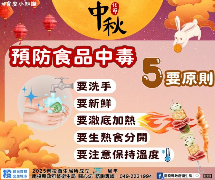 局長陳南松提醒,中秋節是闔家團聚、共享美食的時刻,但食品安全仍需謹慎注意。建議民眾在準備餐點時,確實遵循「勤洗手、選新鮮、生熟食分開、掌握保存溫度、徹底加熱」五大原則。這些步驟雖然簡單,卻是預防食品中毒最有效的方式。勤洗手能避免病菌進入食材;挑選新鮮食材能確保品質與安全;生熟食分開處理則可降低交叉污染風險;妥善保存於適宜溫度可防止細菌繁殖;而徹底加熱更能消滅潛在病原,守護飲食健康。透過落實這些正確做法,不僅能有效降低食源性疾病風險,也能讓家人、朋友在佳節中安心享用美食。民眾如有食品衛生安全問題及消費疑義,可電洽南投縣政府衛生局服務專線049-2231994。