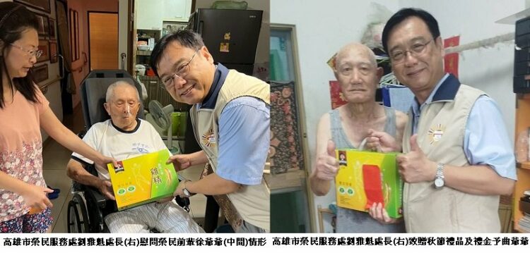 中秋佳節將至,高雄市榮民服務處劉雅魁處長帶領同仁前往左營區,實地探視榮民長輩,致上佳節問候與祝福,傳遞輔導會「榮民在那裡,服務到那裡」的服務精神。劉處長表示,榮民是國家功臣,榮服處同仁將以家人般的心意,持續給予最貼心的關懷與協助。