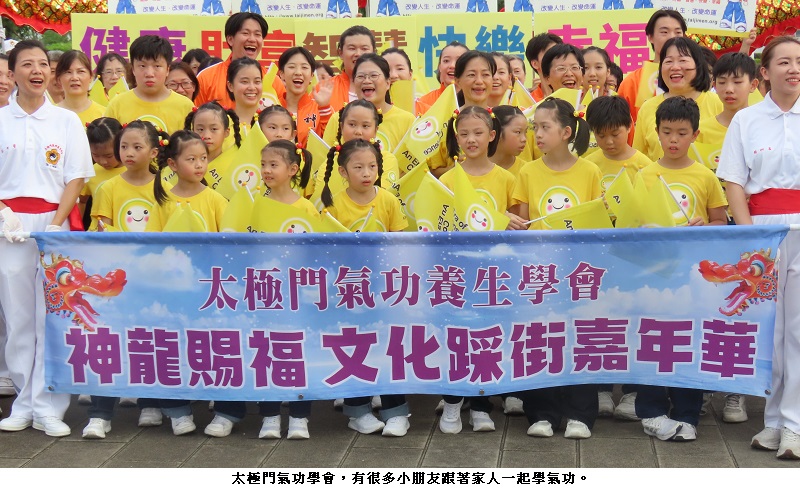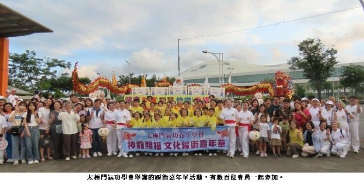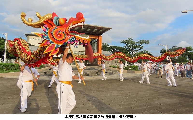 太極門氣功養生學會高雄道館數百名老中青三代的師兄、師姐們,今日下午在捷運衛武營站五號出門前舉辦一場「神龍賜福踩街嘉年華」活動,傳播「健康、財富、智慧、快樂、幸福」於社會。