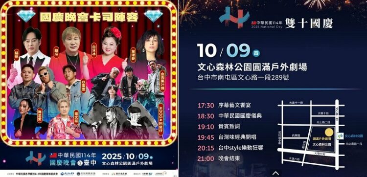 國慶晚會10月9日將於文心森林公園圓滿戶外劇場盛大登場!台中市政府觀光旅遊局表示,晚會以「中華民國」、「台灣味」、「台中Style」為三大主軸,齊聚超強卡司祝賀國家生日快樂,先以大場面、大編制為「中華民國」慶生,續以雙王雙后再現鑽石舞台秀展現道地的「台灣味」,最後以在地新聲代混搭嘻哈大天團的「台中Style」嗨翻全場,邀請全體國人同歡,並肩前行開創新局面。