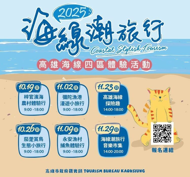 初秋時節,最適合來北高雄漁村海線享受超最Chill 小旅行!高雄海線四區——茄萣、永安、彌陀及梓官,不僅擁有豐富的自然生態景觀與農漁村文化底蘊,也是高雄海洋捕撈漁獲與養漁漁業最重要的產區。高雄市政府觀光局辦理「2025海線潮旅行」活動,規劃「梓官濱海農村體驗行」、「茄萣賞鳥生態小旅行」、「彌陀漁港漫遊小旅行」及「永安漁村捕魚體驗行」四條親子遊程,內容包含漁村巡禮、濕地生態景觀、地方特色美食與趣味 DIY 手作體驗;即日起開放線上報名(網址:https://reurl.cc/MjVYrp)。歡迎大家相約來高雄吹海風、嚐新鮮海味,暢遊海線魅力風光,體驗最道地的漁村風情。