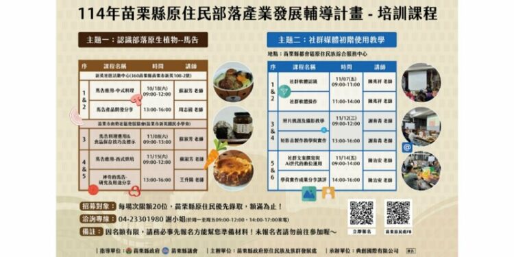 招募與報名資訊:每場次名額限20位學員,苗栗縣原住民優先錄取,額滿即止!歡迎有興趣的民眾踴躍報名,共同學習如何運用在地文化與現代科技,發展屬於部落的產業力量。洽詢專線:04-23301980 謝小姐(服務時間:週一至週五 09:00-12:00、14:00-17:00)。
