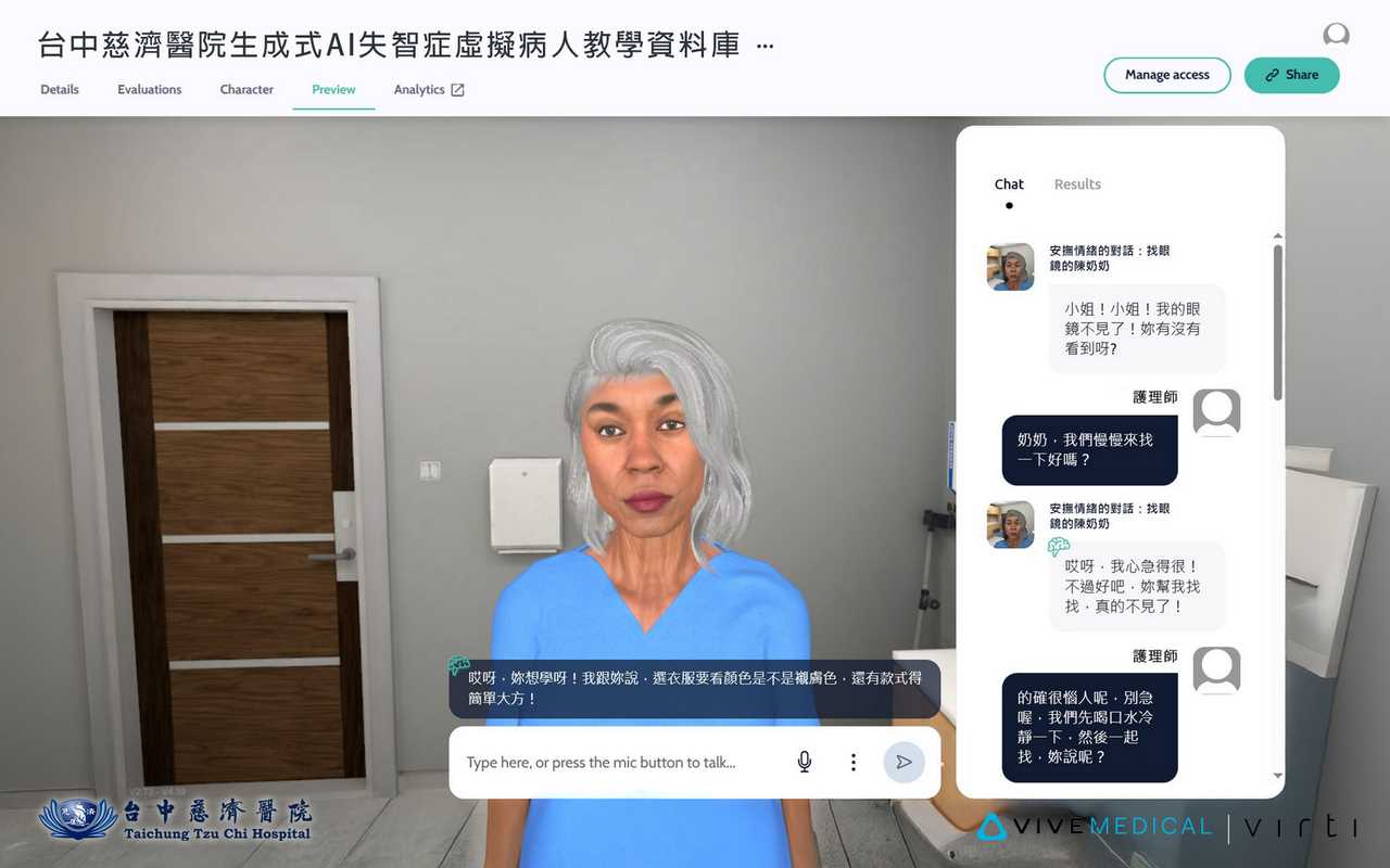 護理人員面對失智長輩的重複問話與突發情緒,往往備感壓力。台中慈院結合生成式AI技術與宏達電合作,打造「AI失智虛擬人教學平臺」,模擬真實照護情境,協助同仁練習與失智長輩對話與應變技巧,系統自動分析互動內容並提供回饋,教學滿意度高達4.62分,心理壓力降低三成,溝通信心提升45%,為長照教育開創嶄新典範。