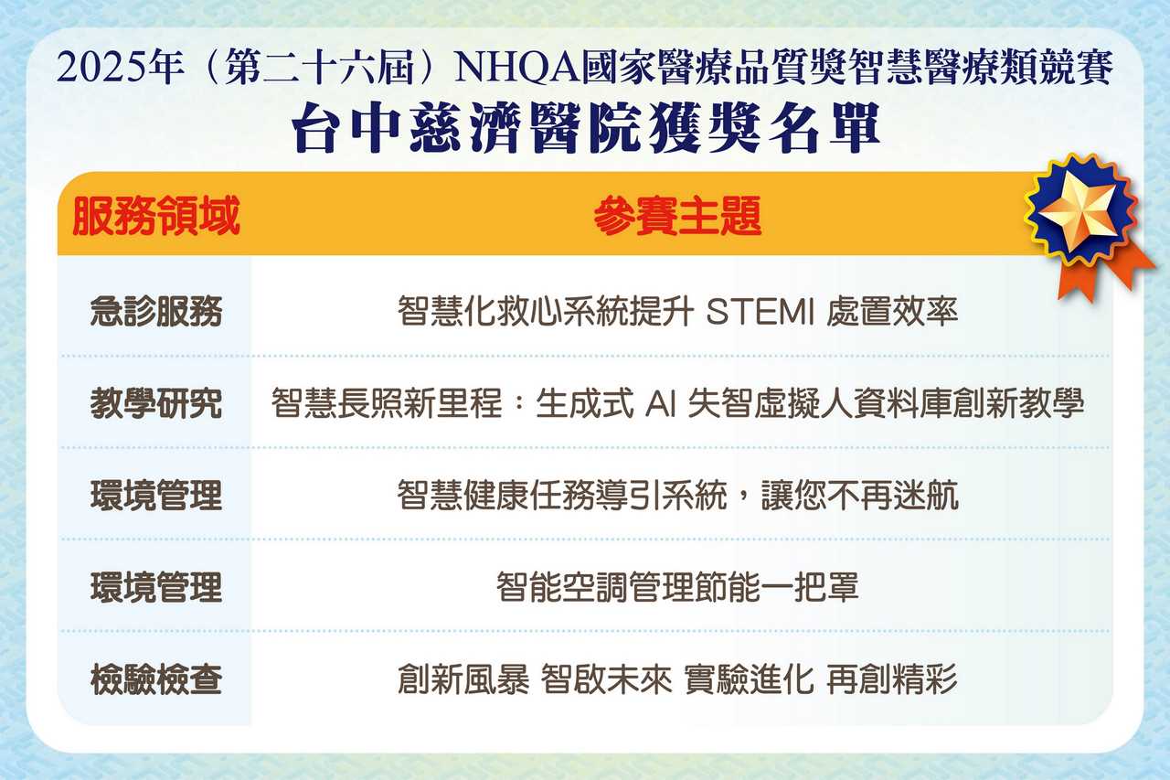 ►第26屆NHQA國家醫療品質獎智慧醫療類競賽,台中慈濟醫院再創佳績,一舉榮獲五項智慧醫療標章。