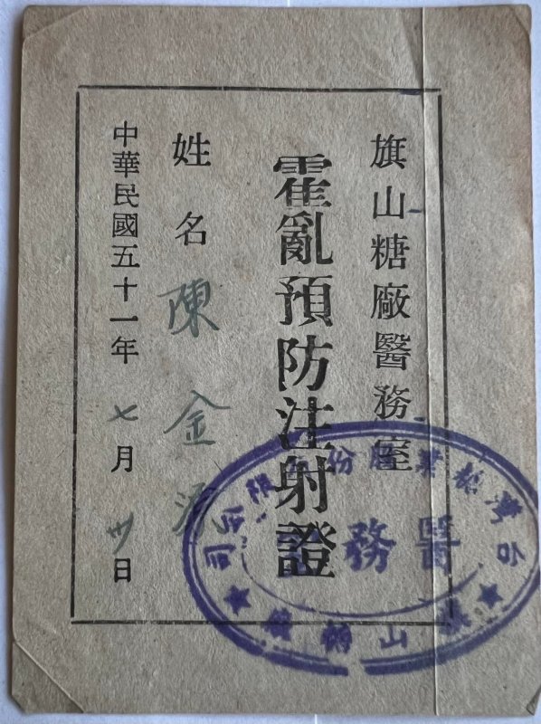 高雄縣旗山鎮,民國51年一張霍亂預防注射證,在臉書上張貼,可能是陳家親友拍照張貼,它薄薄一張紙,記載了那個年代的公共衛生若干舉措。