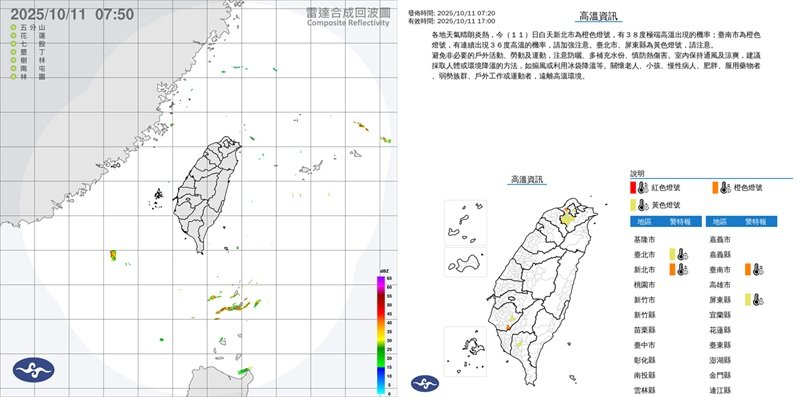紫外線指數方面,週六基隆市、新北市、台北市、桃園市、台東縣、花蓮縣、宜蘭縣、澎湖縣、金門縣為「過量級」;其餘縣市為「高量級」。
