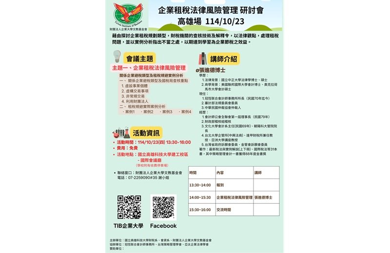 面對美國惡劣關稅及美元匯率雙重打擊壓力,國內企業如何因應自保?由財團法人企業大學基金會及國立高雄科技大學合辦的「企業租稅法律風險管理研討會」,10月23日(星期四)下午1時30分,在高雄科大建工校區舉行,歡迎各界踴躍報名參加。