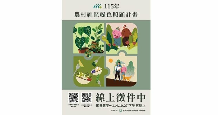 農業部農村發展及水土保持署自即日起啟動「115年農村社區綠色照顧計畫 」,徵件期限至10月27日(星期一)下午5時止,今年首次採線上報名方式,邀請全國農村社區踴躍提案,此計畫旨在透過「綠場域、綠飲食、綠療育、綠陪伴」四大面向,結合在地特色資源,為長者提供多元化的照顧服務,實現健康老化並促進世代共融的美好願景。