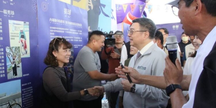 圖:客家文化發展中心「慶30.六堆運動會暨後堆人文影像巡展」行政院長與自行車好手左堆佳冬的楊秀珍選手致意/客發中心 提供