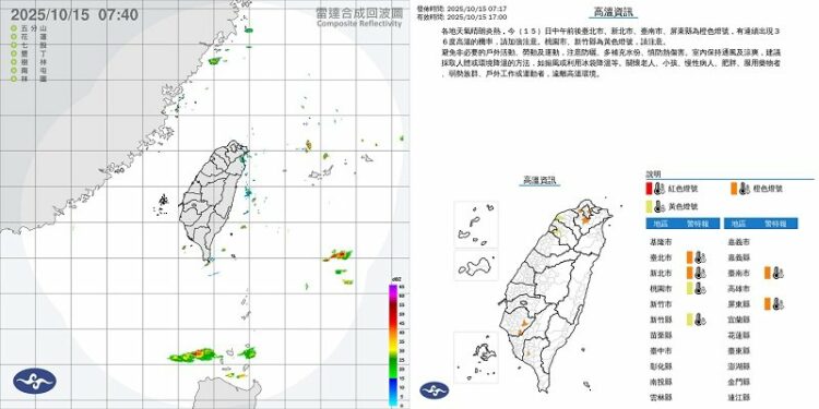 中央氣象署表示,今天(15日)各地大多為多雲到晴的天氣,僅基隆北海岸、恆春半島有零星短暫陣雨,清晨東半部地區有零星短暫陣雨,中午過後嘉義以南地區及各地山區有局部短暫雷陣雨。