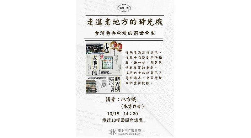 臺北市立圖書館10月份每月一書講座推薦圖書為《走進老地方的時光機:台灣巷弄祕境的前世今生》,將邀請本書作者─地方賊在10月18日(星期六)於總館10樓會議廳進行導讀分享。