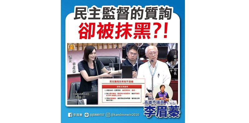 但令李眉蓁不解的是,現場理性問答、澄清事實,怎麼會質詢結束後,衛生局竟然發動這樣的抹黑圖卡?最可怕的是,質詢內容都有網路轉播,一字一句都不會遺漏,她從頭到尾沒有講過「牙醫科鄭醫師停診未公告」這句話,衛生局卻憑空捏造假新聞,然後拿來攻擊李眉蓁。