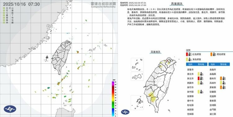 中央氣象署表示,今(16)日環境為偏東風,迎風面水氣稍增,基隆北海岸、大台北山區及宜蘭地區有不定時局部短暫陣雨,花東、大台北地區及恆春半島有零星短暫陣雨,其他地區為多雲到晴,午後高屏地區及其他山區也有零星短暫雷陣雨。