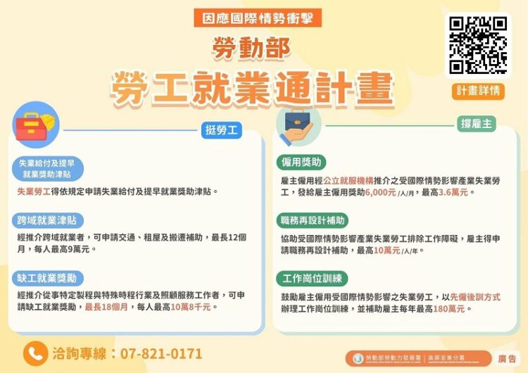 另外,勞動部參考經濟部評估受影響產業範圍,已於114年9月30日先針對受影響較為嚴重的製造業離職勞工,推動「勞工就業通計畫」,若雇主願意全職聘用自製造業離職且經公立就業服務機構推介的失業勞工,每人每月可獲得6,000元僱用獎助,最長6個月。若勞工的技能尚未符合職缺需求,企業也可採取「先僱後訓」的方式,由勞動部補助每人每月1萬2,000元的訓練費,最長3個月,年度最高補助可達180萬元。另外也提供「職務再設計」補助,協助企業改善工作環境、調整工具或流程,讓勞工能更順利地適應職場,每人每年最高可補助10萬元,希望透過計畫的推動,降低國際情勢對勞動市場的衝擊,助力就業雙贏。