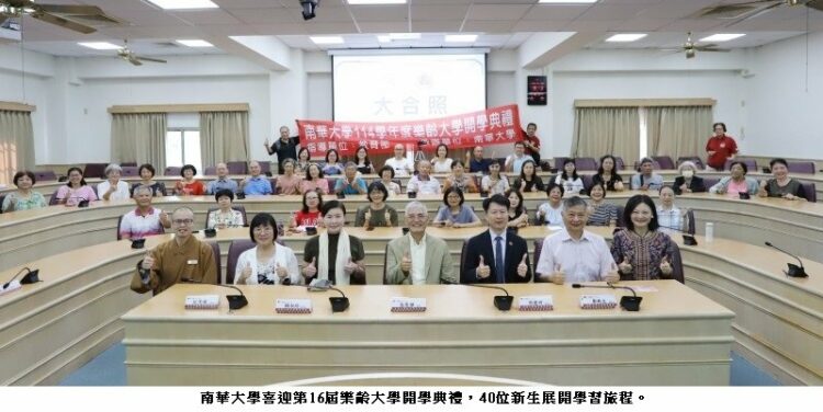 南華大學終身學習學院辦理的「樂齡大學」,於10月14日舉行114學年度開學典禮,迎接40位平均年齡超過65歲的「新生」入學,典禮中長者們滿懷期待地準備迎接他們精彩的「第三人生」學習旅程。正式邁入第16年的樂齡大學,不僅為台灣各地慕名來的無數長者開啟了智慧與幸福的新篇章,更成為台灣高齡學習的典範。