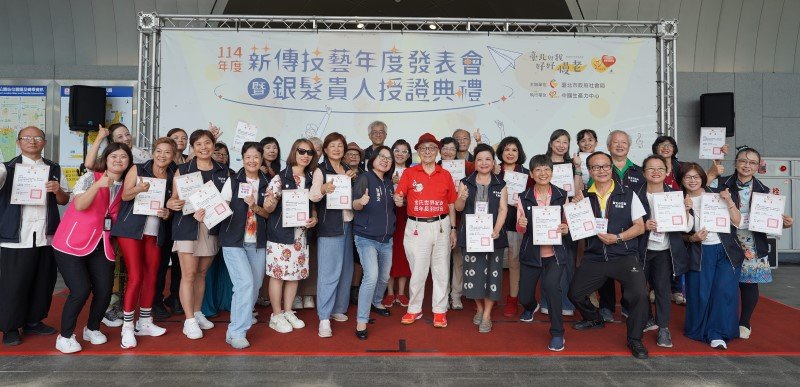 臺北市政府社會局114年重陽系列活動—銀髮貴人薪傳技藝年度發表會17日於捷運大安森林公園站陽光大廳盛大舉辦,這次發表會活動結合今年度新進銀髮貴人授證典禮共同辦理,並特邀世壯運百歲羽球選手-老頑童林友茂先生擔任榮譽銀髮貴人為活動代言,推廣銀髮貴人薪傳公益服務,倡導樂齡運動活躍老化!林友茂除了鼓勵大家應持續運動,就像參加銀髮貴人持續奉獻社會,心態與體態就永遠都會年輕有活力!現場並與銀髮貴人黃佳儷老師共同演示羽球律動,帶領現場所有大哥大姐一起活動筋骨high翻天!