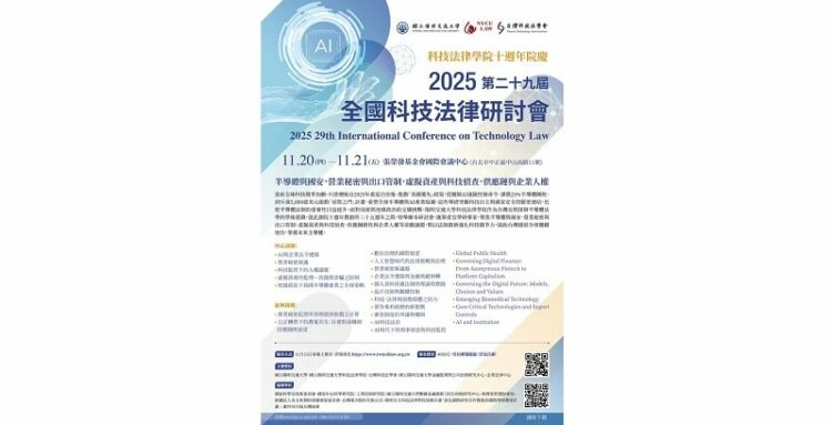 隨著AI技術與半導體戰略成為國際關注焦點,國立陽明交通大學科技法律學院將於2025年11月20日至21日,在台北張榮發基金會國際會議中心舉辦「2025年第29屆全國科技法律研討會」,以「半導體與國安 營業秘密與出口管制 虛擬資產與科技偵查 供應鏈與企業人權」為核心主題,邀集國內外頂尖專家學者與產官界代表,共同探討全球科技競爭下的法律新挑戰。