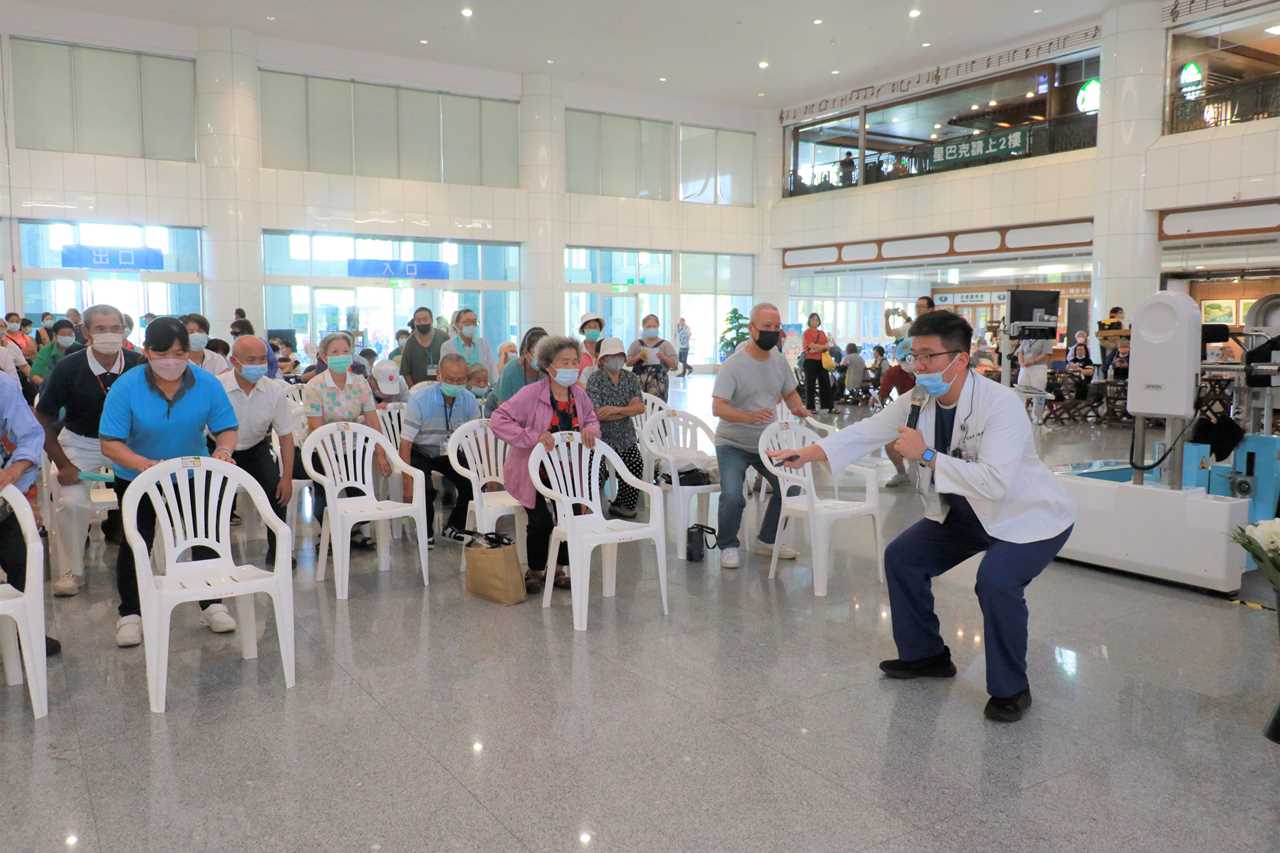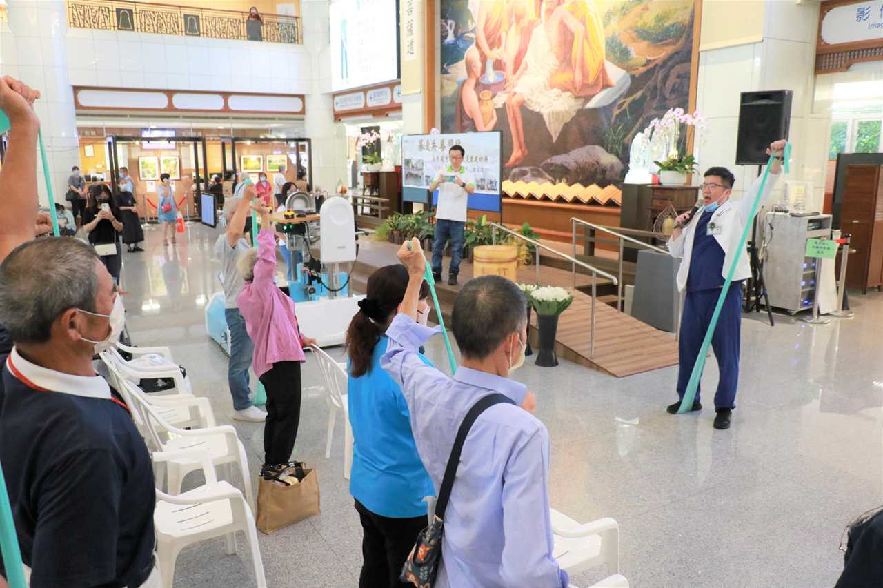 講座也安排實作教學。物理治療師陳義豪現場示範深蹲、小腿肌群及腿後側肌群的分解動作,並運用彈力帶輔助操作。「不用複雜器材,只要一張椅子就能訓練下肢肌群,搭配彈力帶還能啟動背部與手臂等上半身肌群。」陳義豪指出,深蹲可強化股四頭肌,幫助穩定下肢與維持身體平衡。他提醒,運動時應注意呼吸與姿勢,每天可進行兩次,若感覺疲勞就應適度休息,不要勉強。