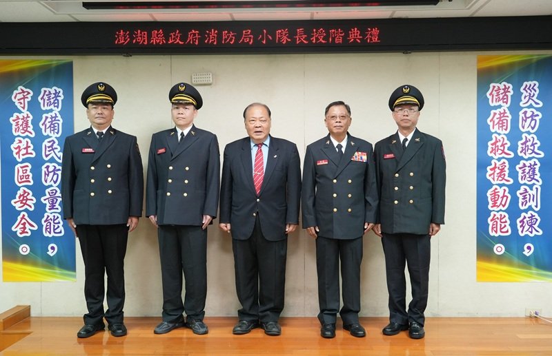 澎湖縣政府消防局今(20)日上午於消防局四樓簡報室舉行小隊長晉陞授階典禮,由縣長陳光復親自主持,為鄭光志、邱柏鈞、蔡吉人三位晉陞小隊長授階,消防局長許文光及同仁皆到場觀禮,共同見證這份榮耀與責任的開始。