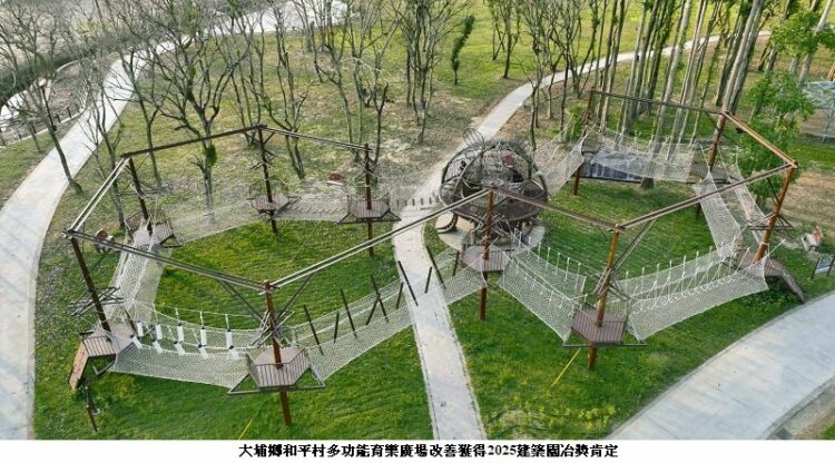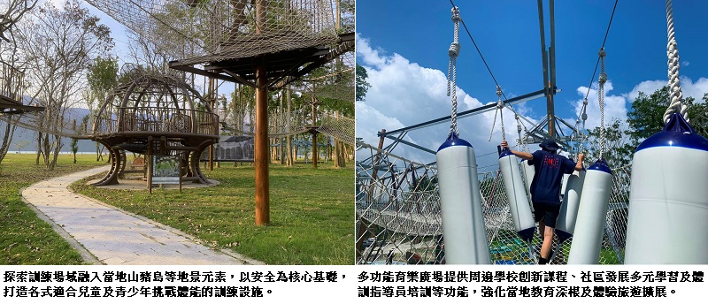 農村水保署南投分署分署長傅桂霖補充說明,和平村多功能育樂廣場融入當地山豬島及飛鷹峽谷等地景語彙,以複層式高架平台為基礎,搭配攀爬網、繩網橋等各式高低空探索設施設計,強化訓練孩童平衡感、肢體技能及核心肌群。場地設置除遵循國際規範外,同時也取得中華體驗學習發展協會認證,設計團隊並特別加強設置雙層防護網、垂直攔截網等安全措施,提升整體安全性。改善過程中亦順應既有地形,採用單元式建構工法,減少周邊生態擾動、降低環境衝擊,共同實踐永續山林的願景。